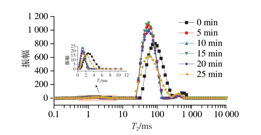 LF-NMR技术中多以氢核(1H)为研究对象,1H以非辐射的方式从高能态转变为低能态的过程称为弛豫[40]。在肉和肉制品中,横向弛豫时间(T2)是一个关键参数,用于分析样品中水分的状态和自由度。T2反映了水分子与周围环境(如蛋白质、脂肪等)的相互作用程度[41]。因此,依据样品中水分子的T2,可以对肉与肉制品中水分的不同状态进行区分[42]。如图9所示,3 个峰对应3 种形态的水分:T21(0~10 ms)代表与大分子紧密结合的结合水;T22(10~100 ms)代表不易流动水,位于肌原纤维网络中;T23(>100 ms)代表容易流失的自由水,主要存在于肌原纤维束之间[43]。如图9和表2所示,随着HVEF处理时间的延长,T21发生小范围波动,这可能由鮰鱼的个体差异引起。相较于对照组,经HVEF处理后,T22缩短,T23有所延长,表明HVEF能够有效调控鱼肉内部水分子状态,延缓水分迁移过程,增强结合水稳定性和鱼肉对自由水的束缚能力。这与2.1节研究结果一致,适当的HVEF处理时间(5~20 min)内,膜通透性的适度改变有利于水分子更好地分布于肌纤维间。其中,T22的缩短与HVEF处理对鱼肉持水力的增强(图8)相关,持水力的增强减少了鱼肉中的水分损失。由表2可知,P22超过90%,说明鱼肉中大部分水分主要是以不易流动水的形式存在[44]。HVEF处理使鱼肉样品T23延长,P21增加,P23降低,表明HVEF处理会促进鱼肉中的蛋白质与水结合,阻碍结合水向自由水转移。且HVEF处理20 min能够更有效地减少鱼肉中的水分损失,使其具有更好的商业价值。