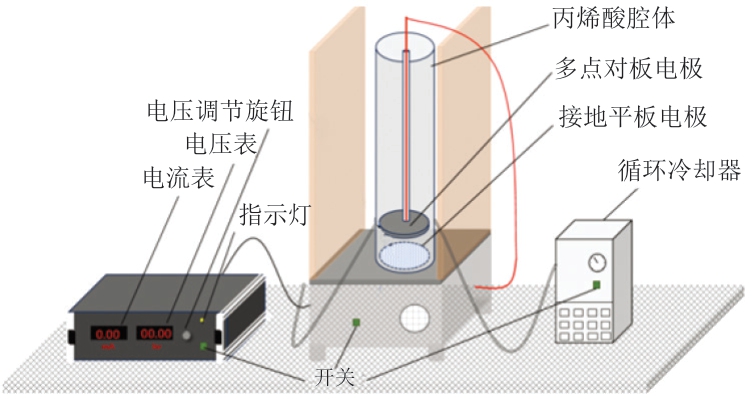 实验所用HVEF装置结构如图1所示,由实验室自主研发并装配完成,主要由全温多点对板电极、丙烯酸腔体(定制丙烯酸材料)、循环冷却器、80 kV电源和电流表(3 mA)组成。参考Huang Han等[3]的方法并稍作改动,将处理好的鱼肉放在圆形水分称量盘(铝箔,半径90 mm、高8 mm)上,置于放电板正下方。
