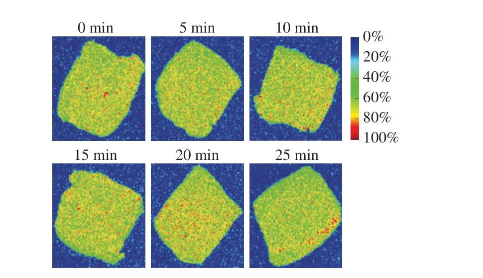 通过MRI技术获得的高分辨率图像能直观反映水分的分布。若信号强则显红色,无信号则显蓝色,同时其质子密度越大,图像中亮度越强,样品中水分含量越高[45]。如图10所示,所有鮰鱼样品均呈黄、红色,表明各组样品水分含量均处于较高水平。对照组样品颜色分布均匀,25 min处理组鱼肉的颜色分布相较于对照组变得不均匀,水分含量也有所降低,15、20 min处理组则表现出均匀且大量的黄、红色。这种现象与长时间HVEF处理导致肌纤维分离和结构破坏密切相关,进一步印证了适度的HVEF处理能够通过改变肌原纤维膜通透性优化水分分布,维持鱼肉的品质。结果表明,HVEF处理能够有效抑制鮰鱼片水分含量的下降,且在处理20 min时效果最佳。