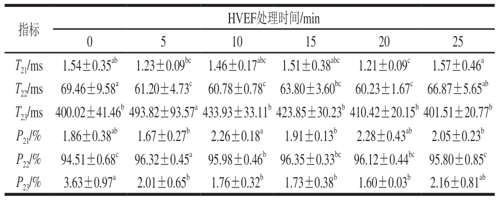 指标HVEF处理时间/min 0 5 10152025 T21/ms1.54±0.35ab1.23±0.09bc1.46±0.17abc1.51±0.38abc1.21±0.09c1.57±0.46a T22/ms69.46±9.58a61.20±4.73c60.78±0.78c63.80±3.60bc60.23±1.67c66.87±5.65ab T23/ms400.02±41.46b493.82±93.57a433.93±33.11b423.85±30.23b410.42±20.15b401.51±20.77b P21/%1.86±0.38ab1.67±0.27b2.26±0.18a1.91±0.13b2.28±0.43ab2.05±0.23b P22/%94.51±0.68c96.32±0.45a95.98±0.46b96.35±0.33bc96.12±0.44bc95.80±0.85c P23/%3.63±0.97a2.01±0.65b1.76±0.32b1.73±0.38b1.60±0.03b2.16±0.81ab