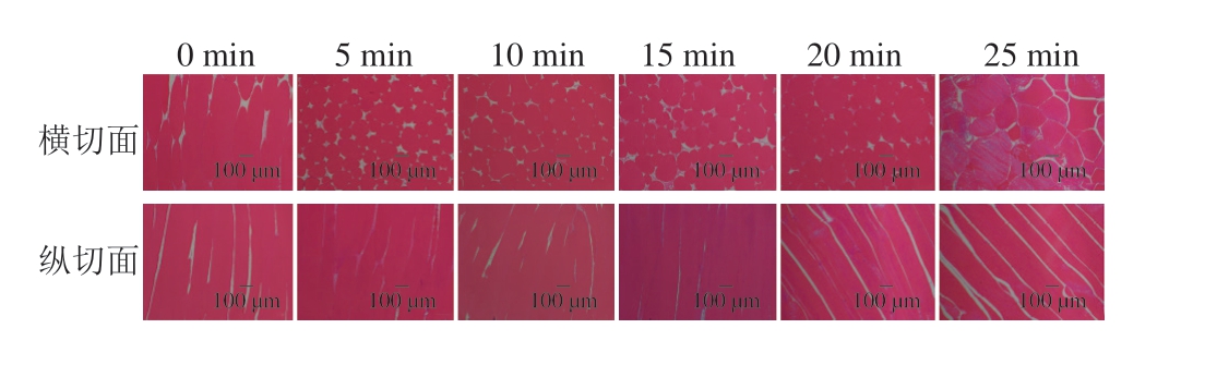 参考高天麒等[19]的方法,垂直于肌原纤维伸展方向为横切,水平于肌原纤维伸展方向为纵切,分别取0.1 cm×0.1 cm×0.1 cm横切、纵切鮰鱼背肌进行脱水、石蜡包埋、切片并染色。用光学显微镜观察鮰鱼样品的微观结构,扫描图像的放大倍数为1 500 倍。