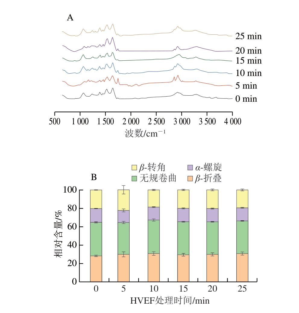 Fig. 4 Effect of different HVEF treatment times on Fourier transform infrared spectrum (A) and protein secondary structure relative content (B) of channel catfish fillets