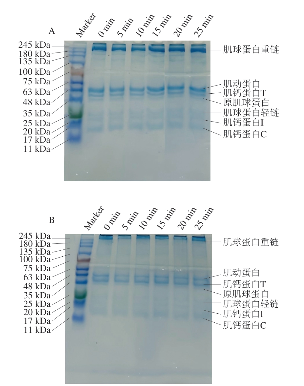在还原条件下,肌球蛋白重链条带的颜色在0~15 min处理期间略有变浅,而在15~25 min处理期间明显变深。相比之下,肌动蛋白和原肌球蛋白条带的颜色随着处理时间的延长明显变浅。肌球蛋白轻链、肌钙蛋白I和肌钙蛋白C条带的颜色随处理时间延长呈波动变浅趋势。这可能表明HVEF处理诱导蛋白质的结构修饰和聚集,导致不同类型蛋白质含量的变化。Ng等[31]研究发现,在还原条件下,随着火花放电处理时间的延长,酪蛋白条带的颜色略有变浅,而β-乳球蛋白条带的颜色略有加深。这种现象归因于通过二硫键形成、疏水和静电相互作用以及蛋白质间交联形成高分子质量聚集体。在本研究中,HVEF能量输入不足以改变MP的一级结构。然而,它足以通过影响分子内交联诱导构象变化。